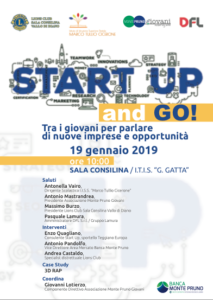 Sabato prossimo, 19 gennaio, alle ore 10 presso l’ITIS Gatta di Sala Consilina si terrà il convegno “START UP AND GO ! – Tra i giovani per parlare di nuove imprese e opportunità”. Il convegno, organizzato dall’Associazione Monte Pruno Giovani affiancata dal Lions Club Sala Consilina-Vallo di Diano, l’I.I.S. M.T. Cicerone e la DFL, sarà un incontro con i giovani studenti dell’ITIS Gatta che avrà quale comune denominatore il tema delle Start Up, quindi rivolto ai giovani che vogliono avviare una micro o piccola impresa. Nel corso dell’incontro interverranno il Consulente dello Sportello Teggiano Europa, Enzo Quagliano, il Vice Direttore Mercato Area Banca Monte Pruno, Antonio Pandolfo e lo Specialist Distrattuale del Lions Club, Andrea Castaldo.