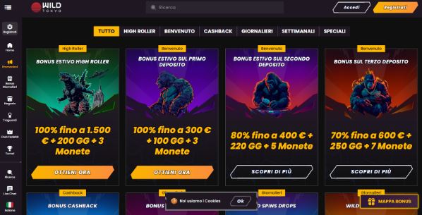 Wild Tokyo è un casinò online dal design moderno e accattivante. Offre oltre 3000 titoli tra slot, giochi da tavolo e live casino. Particolarmente apprezzato per i bonus di benvenuto e per i tornei settimanali con montepremi consistenti. Il sito è veloce e ottimizzato per qualsiasi dispositivo.