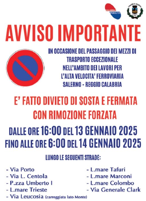 Dalle ore 16 di lunedì 13 gennaio è fatto divieto di sosta e fermata con rimozione forzata lungo le principali arterie della città percorrendo tutto il tratto del lungomare fino alla zona orientale. Dalle ore 16 di lunedì fino alle ore 6 del mattino successivo, martedì 14 gennaio, dovranno restare libere senza auto ed altri veicoli, quindi con divieto di sosta e di fermata Via porto, via Centola, Piazza Umberto I, lungomare Trieste, lungomare Tafuri, Lungomare Marconi, Lungomare Colombo, Via Leucosia (nel tratto lato monte quindi in direzione di marcia opposta) e Via Generale Clark.