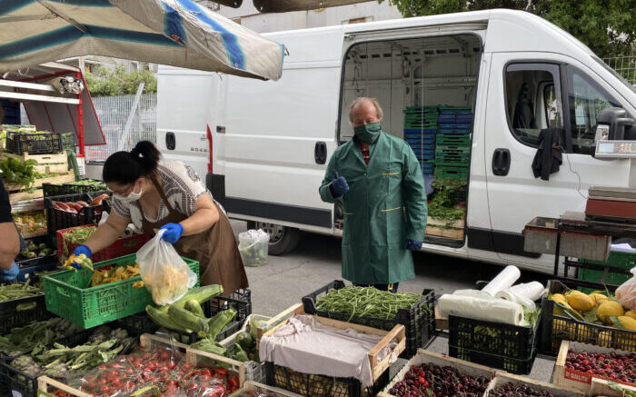 Tra guanti, mascherine e camici, riaprono, a Salerno, i mercati rionali ma solo alla vendita di prodotti agroalimentari. In via De Crescenzo, nel Quartiere Italia, già molte persone questa mattina sono accorse nell’area mercatale che si è preparata ad accogliere i clienti c secondo le disposizioni previste dall’ordinanza regionale con un doppio percorso che indica con precisione l’entrata e l’uscita da seguire. Nessun problema di spaio nè assembramento per l’area che, senza l’occupazione degli stalli destinati alla vendita di altri prodotti, appare abbastanza ampia da rispettare tutte le misure di sicurezza prevista. Ogni postazione per la vendita ambulante è stata dotata di dispenser igienizzante e guanti monouso, disposti dei singoli venditori che a loro volta indossano mascherine, guanti e camice. Qualche perplessità sulle norme, la paura di non riuscire a recuperare quanto perso, ma anche tanto entusiasmo hanno accolto questa prima giornata. Nel mercato situato nella zona orientale della città di Salerno anche pattuglie dei vigili urbani. La priorità è verificare che i venditori abbiano l’autodichiarazione in cui certificano di non essere in quarantena e di non essere positivi al coronavirus.