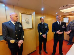 Questa mattina la possibilità di essere ammirata  anche dall’interno. Le visite a bordo saranno aperte oggi fino alle ore 19 e in considerazione della grande affluenza, il Garibaldi, in via del tutto eccezionale, sarà visitabile anche domani (25 aprile) dalle ore 9 alle ore 12.E’ stato il comandante della Capitaneria di Porto di Salerno Attilio Maria Daconto ad accompagnare i giornalisti  a bordo della nave Garibaldi, accolti dall’ Ammiraglio Giacinto Sciandra,  Comandante della seconda Divisione navale della Marina Militare italiana , da un brindisi di benvenuto, occasione per illustrare le navi e le attività di questa prima fase alla presenza del  Comandante del Garibaldi il capitano di vascello Sebastiano Rossitto e del Capitano di Fregata Davide Rossano  Comandante Nave Carabiniere.