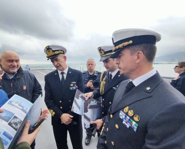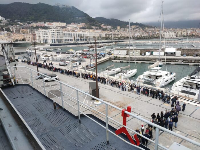 Un’occasione da non perdere. E’ stata così per le tante persone che oggi di buon mattino hanno raggiunto il porto di Salerno (oltre mille persone dalle ore 10 alle 13)  dove è attraccata la  seconda portaerei italiana, la  Nave Garibaldi ormeggiata presso la banchina del Molo Manfredi, dove a poca distanza al porto commerciale c’era anche la fregata “Carabiniere” della Marina Militare.Una tappa speciale anche al porto di Salerno in concomitanza con la conclusione della prima fase dell’esercitazione Mare Aperto 2023, il principale ciclo addestrativo della Forza Armata organizzato e condotto dal comando in capo della squadra navale.6 mila militari coinvolti, personale civile, istituti universitari e centri di ricerca, 23 nazioni (12 Paesi NATO e 11 Partner), 41 unità navali, reparti anfibi della brigata marina San Marco, aerei ed elicotteri dell’Aviazione Navale, incursori e subacquei del COMSUBIN, mezzi navali e aeromobili del corpo delle Capitanerie di Porto e mezzi e personale di Esercito, Aeronautica, Arma dei Carabinieri e Guarda di Finanza.Una tappa che di fatto segna a metà il percorso di addestramento che,  mettendo insieme più persone in attività testa le capacità in un gioco libero in mare, in uno scenario complesso dove le navi sono chiamate ad effettuare diversi tipi di operazioni, a sminare aree,  a cacciare sommergibili. Tutto in una nuova dimensione dove subentrano anche i rischi cyber,  come ha chiarito ai nostri microfoni L’ Ammiraglio Giacinto Sciandra,  Comandante della seconda Divisione navale della Marina Militare italiana. A bordo delle unità della Squadra Navale anche oltre 70 universitari, tra studenti e docenti accompagnatori, pienamente integrati all’interno degli staff imbarcati, in funzione del loro percorso di studi.
