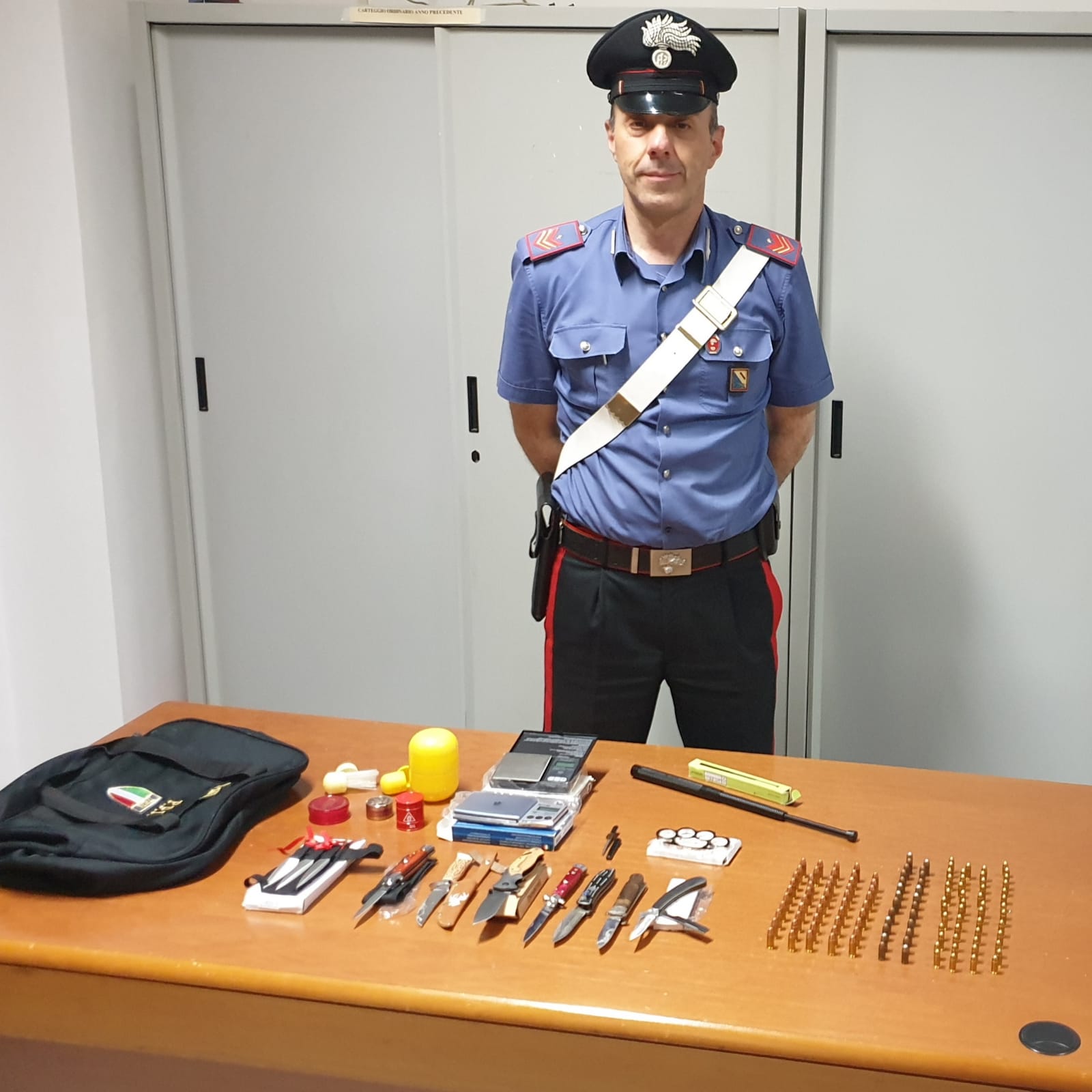 Nella sua abitazione di Montecorvino Rovella a seguito di una perquisizione è stato trovato nascosto in un borsone uno sfollagente di 45 centimetri, un tirapugni in certo, 10 coltelli a serramanico, 125 cartucce di diverso calibro, due bilancini di precisione e tutto il materiale per confezionare droga.