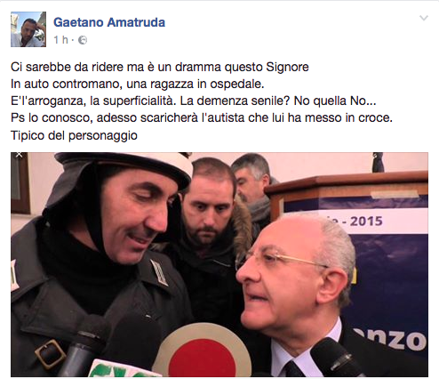 la dinamica dell’incidente verrà confermata, il disprezzo per la legge di De Luca ha portato una ragazza in ospedale. Non è la prima volta che il presidente non rispetta il codice della strada: già a febbraio 2015 ‘Le Iene’ lo avevano beccato a percorrere un divieto d’accesso solo per risparmiare qualche minuto sul percorso verso casa. Ci aspettiamo che anche questa volta farà ricadere la colpa sui suoi collaboratori”. “La misura è davvero colma: De Luca dimostra ogni giorno di più la sua “indegnità”. Speriamo che la ragazza investita possa rimettersi presto” – conclude Ciarambino.