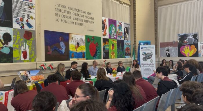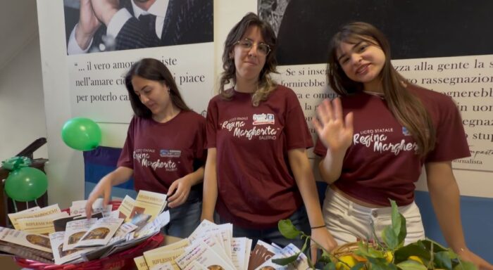 Il tricolore che fa da scenografia all’interno dell’istituto Regina Margherita di Salerno che ha nel suo cuore e non solo la denominazione di liceo del made in Italy. Ma anche le voci e i colori degli studenti che guardano al futuro, affondando le radici nel proprio territorio: un’opportunità di crescita ma anche di lavoro tra formazione e sguardo verso il mondo degli adulti.