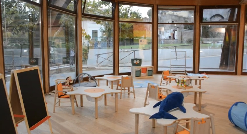 La struttura è stata sviluppata in continuità con aree verdi con una riqualificazione degli spazi esterni, un giardino didattico, una piazza teatro e il ripristino dell’antico limoneto di Palazzo Mezzacapo. Lo spazio, che ospiterà sin da subito quindici bambini, è stato pensato per poterne accogliere fino a un numero di circa quaranta.
