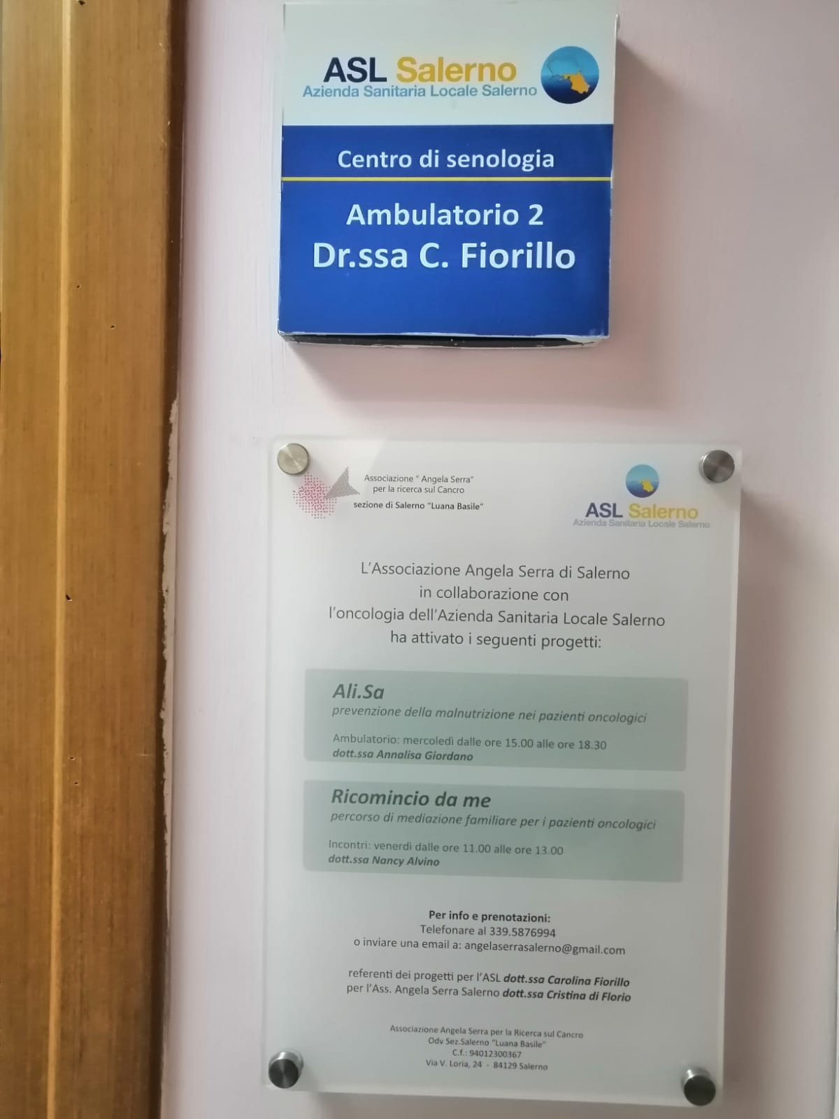 Grazie anche al Dr. Pasquale Melillo, Direttore DS 66 dell’ASL Salerno, al Dr. Carmelo Petraglia, Dirigente della U.O. Materno infantile del DS 66 e alla dott.ssa Carolina Fiorillo, Responsabile Oncologia Azienda Sanitaria Locale Salerno, che hanno fortemente creduto i due iniziative, l’Ass. Angela Serra di Salerno in collaborazione con l’ambulatorio di oncologia e senologia dell’Azienda Sanitaria Locale Salerno ha dato il via a due progetti: “Ricomincio da me: percorso di mediazione familiare per i pazienti oncologici” e “Ali.Sa: prevenzione della malnutrizione nei pazienti oncologici”.