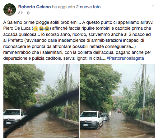 Immediato il commento del consigliere di opposizione, Roberto Celano, che attraverso un post su facebook ha evidenziato le difficoltà che la città di Salerno affronta ogni qualvolta ci sia una pioggia, “appellandosi” ironicamente al figlio del Governatore, Piero De Luca, affinchè possa intervenire sulla pulizia di tombini e caditoie da parte dei tecnici comunali.