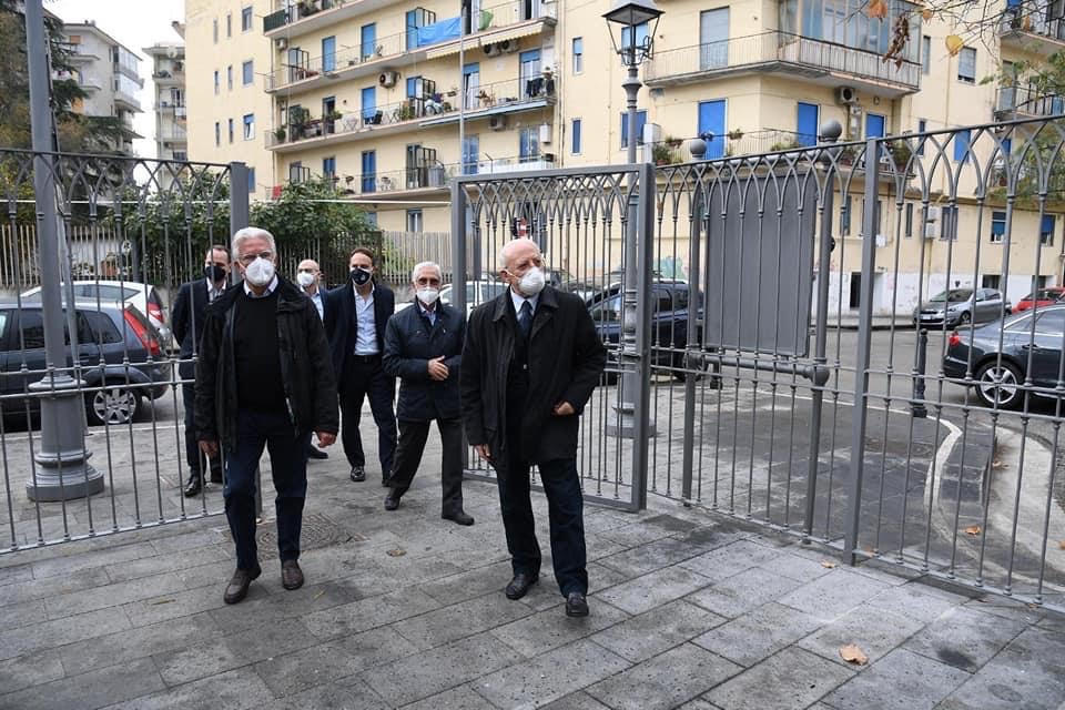 Lo aveva promesso prima del Covid. La Chiesa avrà il suo sagrato recintato e protetto. E ha mantenuto l’impegno preso con il parroco di Mercatello Don Antonio Galderisi. Smentendo quanti lo danno in cattive condizioni di salute, il presidente della regione Campania, Vincenzo De Luca a sorpresa si è presentato stamani a Mercatello per consegnare l’intervento preso ante covid. Alla presenza del sindaco di Salerno Vincenzo Napoli, in compagnia dell’assessore al commercio Dario Loffredo, del fedelissimo Felice Marotta, il primogenito Piero, deputato del Partito Democratico ed il segretario dello stesso, Enzo Luciano, il presidente della Regione Campania ha consegna il lavoro concluso al parroco che raccogliendo le sollecitazioni dei residenti aveva chiesto di chiudere la zona, teatro durante le serate di scorribande notturne e schiamazzi.