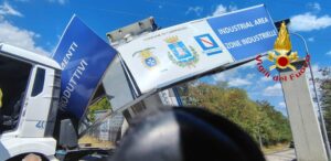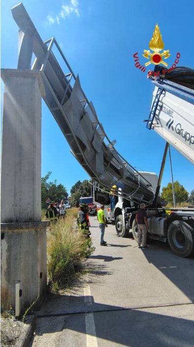 conducente, un mezzo pesante in transito ha urtato e divelto la segnaletica stradale che poi ha invaso la carreggiata.