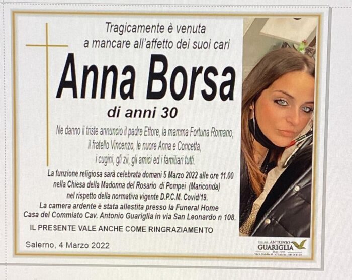 Domani mattina alle 11 saranno celebrati i funerali nella chiesa Maria Santissima del Rosario di Pompei del quartiere Mariconda di Salerno dove la famiglia della giovane era molto conosciuta.