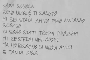 Per lui – artista pluripremiato, come racconta la mamma, con l’opera ‘Siamo ali della stessa farfalla’, con cui ha portato un forte messaggio sociale da Salerno a Sanremo fino a Parigi – è stato un colpo durissimo. Mesi di disagio per la perdita della figura di riferimento stabile. Una sofferenza resa più grave, spiega la mamma, da l fatto che suo figlio continuava a vedere nella stessa scuola il suo professore. Così dal 6 febbraio scorso Nicolò ha smesso di frequentare la sua scuola. Una decisione sofferta. Ma la mamma non si è arresa ed ha avviato una battaglia per trovare una nuova scuola per suo figlio.