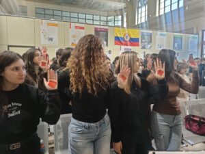 Con un adesivo rosso incollato al centro della mano gli studenti del liceo Regina Margherita hanno alzato le mani tutti insieme in opposizione simbolica contro la violenza.