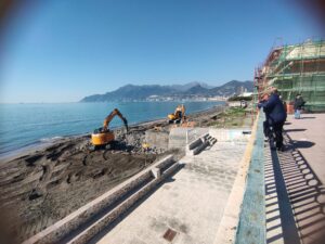 E mentre il mare scava, poco distante le ruspe lavorano senza sosta. È partito il secondo cantiere per il rifacimento della spiaggia sul tratto di Torrione dell’Ostello della Gioventu’ e della vicina Piscina Comunale Vitale. Anche stamani le ruspe erano in azione per abbattere un canale di scarico in cemento utile a restituire altro spazio alla spiaggia . Un’operazione di riqualificazione e protezione costiera mentre restano transennate le aree dei giardini di Asia e del pattinodromo risucchiate dal mare,  ferite ancora aperte di cui ancora non si sa come ricucirle.