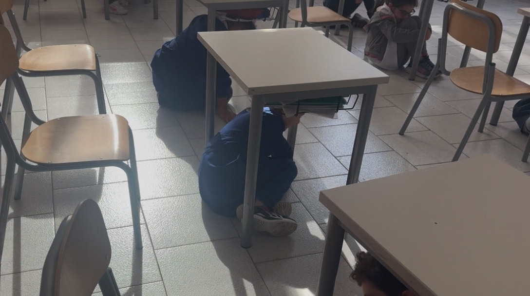 Stamani, al suono di una sirena degli alunni si sono prima riparati sotto i banchi e poi sono usciti dalle aule e, con l’aiuto delle maestre, sono andati nel cortile, dove le insegnanti hanno fatto l’appello per sincerarsi della presenza di tutti i piccoli studenti.