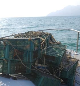 Gli attrezzi, costituiti da rudimentali cassette in plastica, erano collegati ad una cima di circa 300 metri assicurata al fondale mediante due pesi in cemento e segnalati da bottiglie per agevolarne il recupero e renderne difficile l’individuazione da parte degli organi di vigilanza.