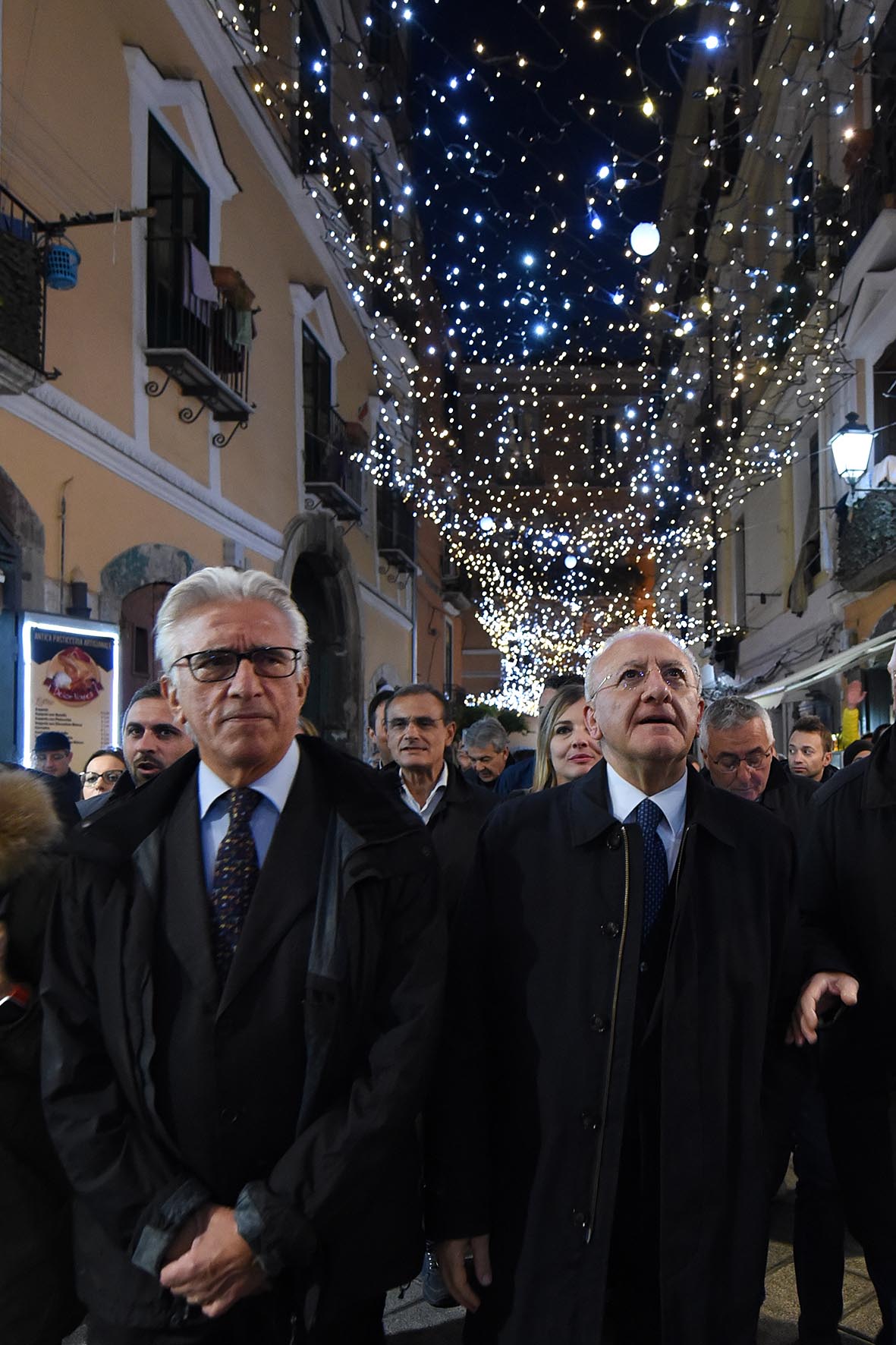 Fiat Lux e così Salerno si è illuminata. Non tutta però come accadeva fino allo scorso anno. Illuminazione parziale da ascrivere al ritardo con il quale si è proceduto all’installazione degli impianti illuminotecnici, scorie della querelle che ha visto contrapposti il comune e la Blanchere Illumination. Dunque luminarie accese solo nel cuore della city e neanche per intero in considerazione del buio che ancora caratterizza Largo Campo da sempre uno dei luoghi più suggestivi e ammirati del percorso di Luci d’Artista. Inaugurazione sobria quella cui si è dato vita nel pomeriggio di sabato perchè, a differenza