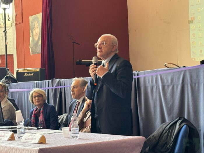 Governatore è intervenuto sulla vicenda, chiedendo ai magistrati di chiarire la questione in termini ultra rapidi. Il Presidente della regione Campania ha partecipato questa mattina ad un incontro presso il liceo Da Procida di Salerno sui disturbi alimentari e come sempre ha parlato a cuore aperto con i giovani, partendo dalle sue origini, umili, per ribadire ancora una volta, tra i ragazzi, la necessità di essere orgogliosi delle proprie radici e di non inseguire mode e stili di vita di lusso. De Luca, nel corso dell’incontro che ha visto tra i presenti anche lo chef Gennarino Esposito, ha chiesto ai ragazzi di allontanarsi dalla moda del consumo dei superalcolici così comeda quella di indossare sempre un’arma, il ferro, ha detto utilizzando il linguaggio dei giovani. Poi c’è stato spazio anche per ricordare la sua battaglia sui pericoli sull’autonomia differenziata, la crisi dei valori davanti ai genocidi che dal Mar Mediterraneo , da Gaza e Ucraina e poi, ancora una volta volta, il riferimento ai test di medicina. Poi uscendo, soffermandosi con i giornalisti, il presidente ha espresso la sua soddisfazione per quanto sta avvenendo all’aeroporto Costa da Amalfi di Salerno rivendicandolo come un suo successo e sottolineando che cambierà il destino del territorio salernitano. La giornata tra gli studenti del Procida si è chiusa con un simpatico siparietto. La rappresentante dell’associazione Mulieres Salernitane ha donato al Presidente un suo ritratto fatto durante il periodo del COVID e conservato nella scuola per l’impossibilità di consegnarlo direttamente nelle mani del Governatore che ha oggi ha finalmente ricevuto e gradito l’omaggio.