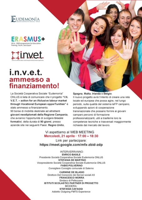 Il Comune di Pellezzano, partner della Soc. Coop. “Eudemonìa” ONLUS, è stato ammesso al finanziamento per promuovere il progetto Erasmus + “I.N. V.E.T” (action for an iNclusive labour market through Vocational European opporTunities). Si tratta di un progetto che consente l’assegnazione di 90 borse di mobilità destinate ad altrettanti giovani neodiplomati della Regione Campania, che avranno l’opportunità di svolgere tirocini formativi, della durata di 90 giorni, presso aziende site nei seguenti Paesi: Regno Unito, Spagna, Malta, Irlanda e Belgio.Il nuovo progetto avrà l’intento di creare una rete locale ed europea che possa agire, nel lungo periodo, sulla qualità del sistema leFP campano, sviluppando azioni di cooperazione transnazionale che possano fornire ai giovani campani percorsi di formazione professionalizzanti, utili a trasferire loro le competenze tecniche e trasversali maggiormente richieste dal mercato del lavoro.