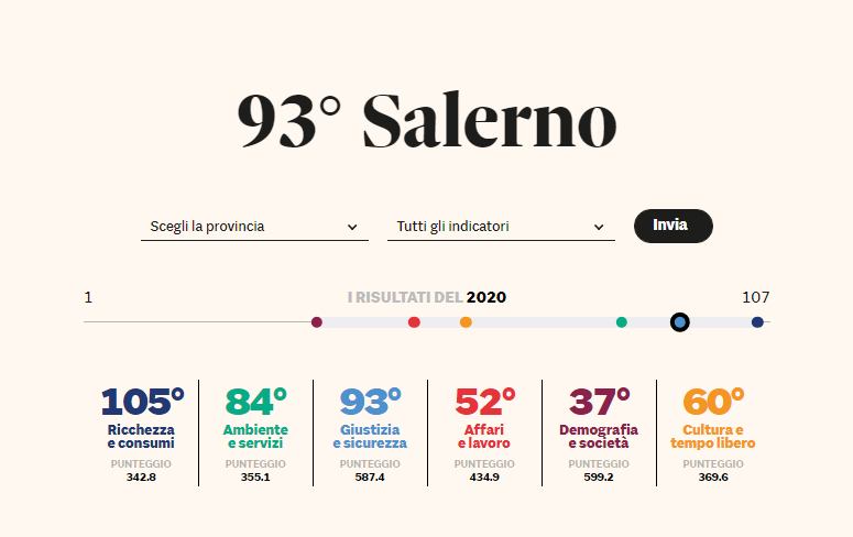 Le aree tematiche di analisi, tuttavia, rimangono invariate: Ricchezza e consumi; Demografia e salute; Affari e lavoro; Ambiente e servizi; Giustizia e sicurezza; Cultura e tempo libero. La classifica generale premia Bologna, al primo posto, che traina un po’ tutte le province dell’Emilia Romagna mentre relega in fondo alla classifica le province della Campania. La provincia di Salerno, in particolare, si attesta al novantatreesimo posto appena dietro a quella di Napoli, che pure perde ben undici posizioni rispetto all’anno precedente. Tra i risultati peggiori registrati dalla provincia di Salerno ci sono l’indice relativo alla ricchezza e ai consumi per il quale Salerno è 105esima ed addirittura uno scalino più in giù 106 se si prende in considerazione l’indice che valuta il rischio climatico. Salerno è anche al 96 esimo posto per numero di incendi, altra piaga che colpisce il territorio provinciale. In testa alla classifica Salerno c’è ma spesso per indici in qualche modo negativi. Salerno per esempio è tredicesima se si considera la quantità di persone che percepiscono redditto di cittadinanza.