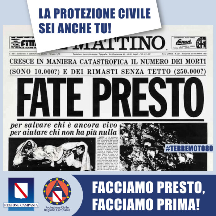 Per seguire la campagna dedicata al terremoto del 1980 è possibile collegarsi alla pagina Fb della Regione Campania e della Protezione civile della Regione Campania