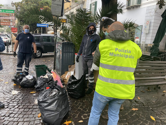 Prosegue l’azione di controllo e sanzione dei vigili urbani di Salerno contro lo smaltimento irregolare dei rifiuti. nuovo blitz questa mattina davanti alla chiesa di Santa Lucia. le squadre speciali composte dal nucleo operativo comunale dei vigli urbani di Salerno e gli operai della Salerno Pulita frugano tra i rifiuti alla ricerca di qualsiasi elemento che sia utile a risalire all’abbandono indiscriminato di spazzatura di ogni genere. Uno scontrino della lavanderia, una ricevuta, tutto ciò che può dare un volto è utile e viene messo da parte. Così gli agenti della polizia urbana, guidati dalla comandante Rosario Battipaglia con lo speciale nucleo operativo, oggi coordinato da Francesco Alaia che sostituisce Carmine Novella, assente per problemi di salute, indagano nella spazzatura con gli operai di Salerno Pulita per dare un volto a chi non rispetta le regole. Molto spesso a trasgredire le regole sono gestori di attività di ristorazione. L’indagine di oggi risale e sanziona i titolari di due bar. ad assistere alla scena anche il gestore di una friggitoria che, a nome della categoria che rispetta le regole, chiede però maggiore comprensione delle esigenze.