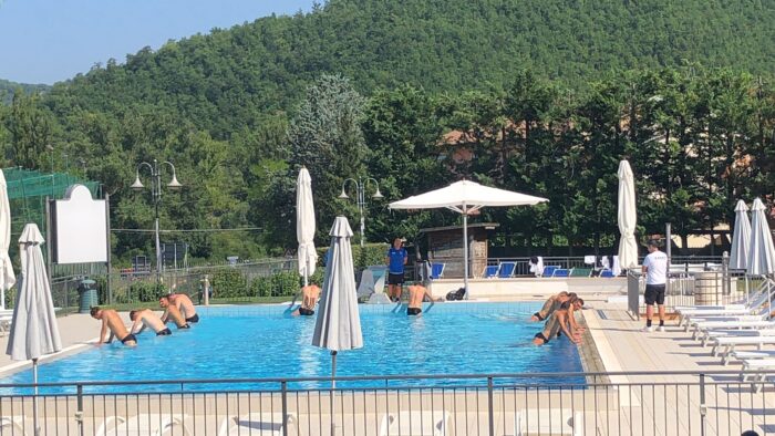 Mattinata di lavoro in piscina per la Salernitana all’ultimo giorno qui nel ritiro di Cascia. Dopo la vittoria nel test match di ieri contro la Fermana, un gruppo di giocatori questa mattina ha svolto un defaticante in piscina. Un paio di baby tifosi granata ha intercettato Belec, Ruggeri e Di Tacchio all’esterno della struttura che li ospita per farsi fotografare e autografare le maglie. Volto disteso dei giocatori che anche in questa occasione hanno potuto constatare la vicinanza della piazza. Mister Castori poi è stato omaggiato di una bottiglia di vino e di una maglia del Club Mai Sola presente qui a Cascia col presidente Carmando e gli altri. Oggi pomeriggio riposo e domattina si parte direzione San Gregorio Magno in attesa dell’amichevole contro il Palermo.