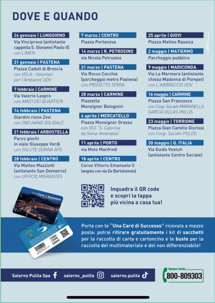 Tornano dal 24 gennaio i centri itineranti di raccolta e riuso di Salerno Pulita, gli eventi mobili che si tengono periodicamente, ogni sabato dalle 9 alle 12,30 nei quartieri, trasformando la raccolta differenziata in un’occasione di economia circolare, dove i cittadini possono conferire materiali come piccoli RAEE, tessili, oli esausti, farmaci scaduti e pile, ma anche donare abiti, giocattoli, elettrodomestici ancora funzionanti, mobili e oggetti in buono stato per il riuso, tramite la collaborazione con associazioni, dando loro una seconda vita e promuovendo la sostenibilità. In collaborazione, poi, con l’app Junker, il centro di riuso funzionerà anche da base per i materiali intercettati attraverso la bacheca del riuso, cioè i cittadini potranno utilizzare il gazebo del centro mobile per lo scambio. Anche per queste tappe, compagno speciale sarà la Centrale del Latte Salerno che donerà i suoi prodotti oltre ai gadget di Salerno Pulita per i cittadini virtuosi che utilizzeranno le opportunità offerte dall’iniziativa itinerante. Attraverso i centri di raccolta mobile i cittadini possono anche prenotare il ritiro ingombranti attraverso il servizio gratuito a domicilio per elettrodomestici e mobili grandi. È, poi, possibile ritirare gratuitamente il kit di sacchetti per la carta e di buste per il multimateriale ed il non differenziabile e ricevere qualsiasi tipo di informazioni, oltre che richiedere il rilascio della card di Salerno Pulita. “Oltre a promuovere concretamente azioni di sostenibilità ambientale- ha dichiarato Vincenzo Bennet, amministratore unico di Salerno Pulita- i Centri di raccolta e riuso rappresentano per noi anche un’occasione diretta di confronto con i cittadini, che possono segnalarci disagi ed aiutare a migliorare il nostro lavoro”. Le tappe cambiano ogni settimana: il calendario è pubblicato su tutti i social e sul sito di Salerno Pulita. Ogni sabato. fino al 30 maggio in un quartiere diverso, dalle 9 alle 12,30. Dopo poi l’interruzione estiva, l’iniziativa verrà ripresa da settembre a novembre.
