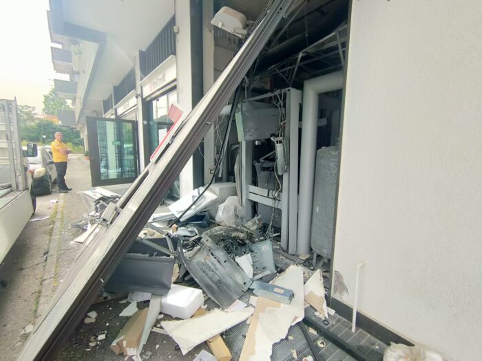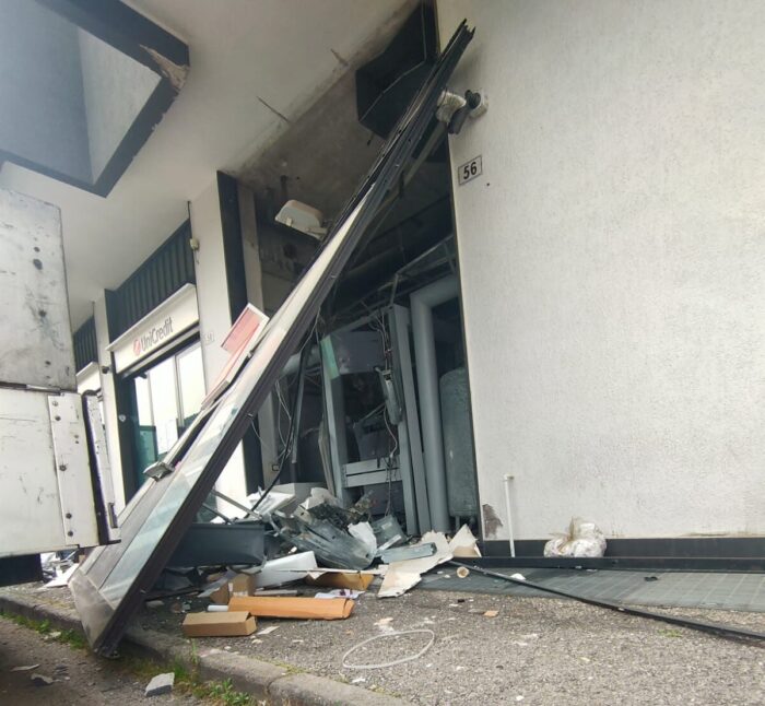 E’ successo stanotte intorno alle 4 quando un forte boato ha risvegliato i residenti del Parco Arbostella. Con un esplosivo hanno fatto saltare lo sportello del bancomat con un’implosione interna, sradicandolo così verso l’esterno e facendo venire giù tutta la controsoffittatura, riuscendo a mettere in una borsa le numerose banconote che erano state caricare per questo weekend, ma scattato l’allarme è sopraggiunta sul posto una pattuglia delle volanti che si trovava a poco distanza che ha messo in fuga due persone appiedate, vestite di nero incappucciate e con volti travisati, alte e fisicamente piazziate. I due, durante la corsa, a circa 10 metri dalla banca, hanno però abbandonato una borsa, tipo shopping per la spesa, contenente soldi taglio da venti euro. A detta della direttrice della banca presente sul posto, i ladri non avrebbero toccato l’altra slot con il taglio da 50 euro.