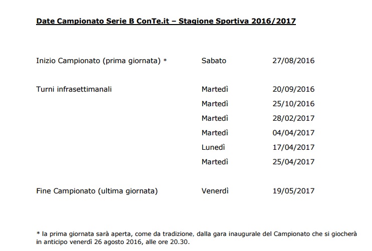 Campionato che scatterà ufficialmente nel weekend del 26/27 Agosto 2016 e vedrà la chiusura della regular season il 19 Maggio 2017. Saranno sei in totale in turni infrasettimanali. Nel dettaglio tutte le date: