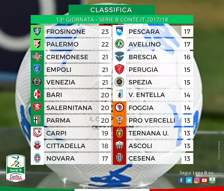 Nuova giornata, nuova capolista. E’ il leitmotive del campionato cadetto che anche per la 13^ giornata conferma quanto avvenuto fin’ora. In vetta ora c’è il Frosinone che batte di misura il Parma e tocca quota 23 punti. 2-1 il finale con i gol di Maiello e Ciano per i ciociari e l’autorete dello stesso Maiello che riduce le distanze. Un gol di Ardemagni nel primo tempo ed uno di Cerri nella ripresa decidono il posticipo tra Perugia ed Avellino. Lo Spezia impone il pari casalingo all’Empoli. 1-1 il finale con i gol siglati entrambi nella ripresa. Liguri in vantaggio al 53′ con Mastinu poi nel finale i toscani agguantano il pari con Pasqual. Il Palermo impatta 2-2 nella trasferta di Pescara. Al vantaggio adriatico siglato da Capone rispondono i gol dei palermitani Chochev e Nestorovski. Ad inizio ripresa gli uomini di Zeman pareggiano il match grazie ad un gol di Brugman. Colpaccio-impresa della Cremonese che sotto di due gol a Foggia riesce a vincere il match. Foggia che con Coletti e Beretta si porta sul 2-0 poi, sul finire del primo tempo, in meno di cinque minuti si fa recuperare dai gol di Brighenti e Mokulu. Ad inizio ripresa compie l’impresa con Piccolo che sigla il gol vittoria. Altro colpaccio della giornata lo mette a segno il Venezia che va ad espugnare il “Rigamonti” di Brescia. Gara pazzesca con tre gol negli ultimi cinque minuti di gioco. Le rondinelle passano in vantaggio con Caracciolo poi vengono acciuffati dal gol di Pinato e addirittura superati dal gol di Falzerano. Il Carpi torna al successo battendo tra le mura amiche del “Cabassi” l’Ascoli con il punteggio di 4-2. Ospiti per primi in vantaggio con Parlati poi, grazie ad una doppietta di Malcore, gli emiliani ribaltano il risultato. La prima frazione di gioco si chiude con il pareggio ascolano siglato da Favilli. Ad inizio ripresa è ancora Malcore che sigla il nuovo vantaggio carpigiano. Vantaggio che irrobustisce con il gol di Carletti che chiude la gara sul 4-2. Cittadella e Ternana pareggiano 1-1. Al vantaggio veneto siglato da Arrighini, la Ternana risponede con il gol del pareggio di Carretta. Brutto tonfo interno per il Novara che cade nel derby con la Pro Vercelli. Il match winner è Morra. Rocambolesco pareggio per 2-2 anche tra Entella e Cesena. Romagnoli che con Jallow si portano sullo 0-2 poi prima Lamantia e poi Diaw recuperano il risultato per i liguri.