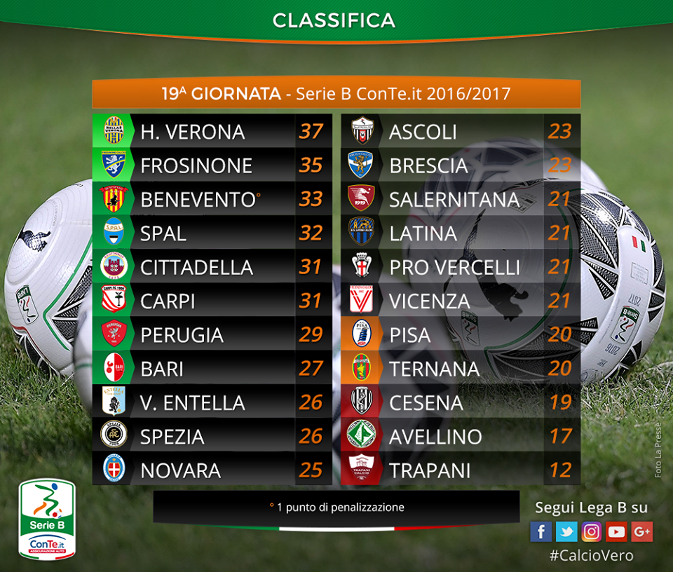 1 commento su “SERIE B, RISULTATI E CLASSIFICA DELLA 19^ GIORNATA”