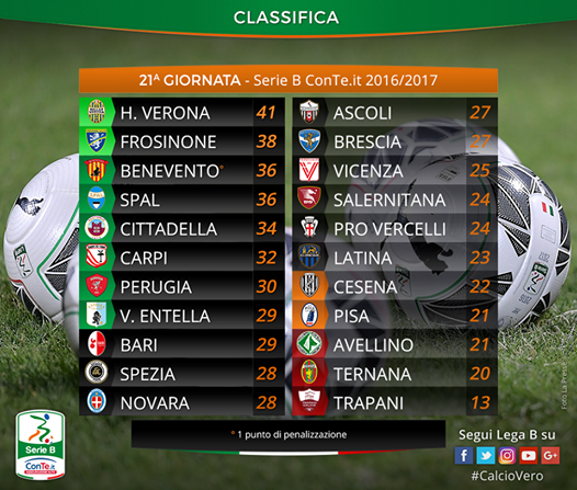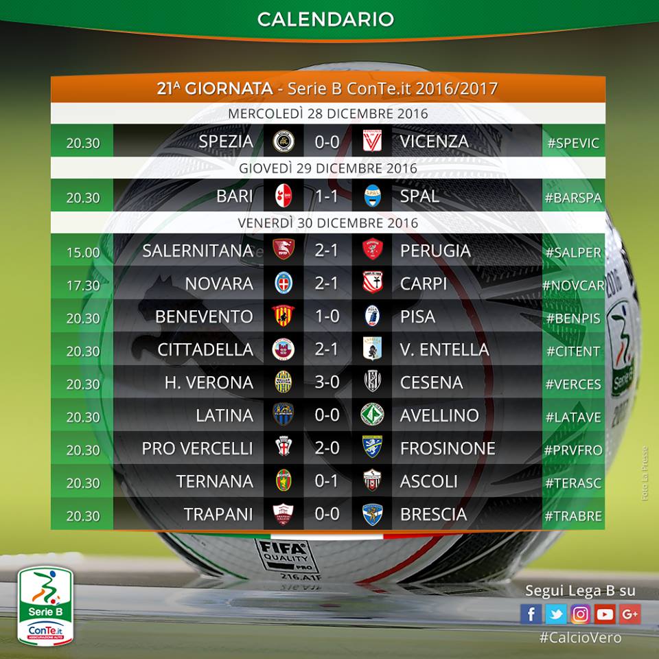 Dopo gli anticipi tra Spezia-Vicenza (0-0) e Bari-Spal (1-1), in giornata si sono disputate le altre gare che hanno completato il quadro della 21^ giornata. L’Hellas Verona si laurea campione d’inverno. Battendo 3-0 il Cesena, ed approfittando dell’inaspettato stop del Frosinone a Vercelli, gli scaligeri si riprendono la vetta in soltaria. In gol Bessa, Pazzini e Boider. Brutta sconfitta per il Frosinone che a Vercelli cade 2-0. Con un gol per tempo Lamantia decide il match. Il Benevento vince di misura sul Pisa e sale al terzo posto a quota 36 punti. I sanniti battono 1-0 i toscani grazie ad un gol di Cisse. Torna al successo pure il Cittadella che vince 2-1 sulla Virtus Entella. Al gol iniziale di Arrighini, ad inizio ripresa i liguri rispondono con il gol del pareggio di Diaw, pochi minuti più tardi Strizzolo va in gol regalando il successo ai suoi. Vittoria in rimonta del Novara che sotto di un gol con il Carpi per effetto della marcatura di Lasagna, tra il 29′ ed il 32′ ribalta il match andando in gol con Galabinov e Sansone. Colpaccio dell’Ascoli a Terni grazie ad un gol nella ripresa di Favilli. Unici pareggi ad occhiali della giornata quelli nei match di Latina-Avellino e Trapani-Brescia.