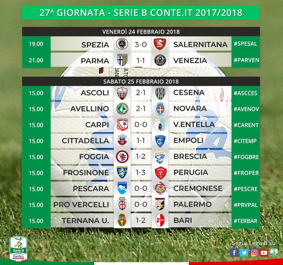 Un gol di Bennacer nel finale tiene l’Empoli in vetta alla classifica del campionato cadetto. I toscani pareggiano 1-1 nella trasferta di Cittadella. Padroni di casa in vantaggio nel primo tempo con Kouamè, poi a pochi secondi dal fischio finale il pareggio toscano con Bennacer. Ad agevolare il primato dell’Empoli è la concomitante sconfitta interna del Frosinone. I ciociari cadono sotto i colpi del Perugia di Breda. Frosinone in vantaggio con Soddimo, poi i grifoni pareggiano subito con Cerri. Nella ripresa prima prima Mustacchio e poi Bonaiuto fissano il punteggio sull’1-3. Al terzo posto si attesta a pari punti la coppia composta da Palermo e Bari. I siciliani strappano un punto dalla trasferta di Vercelli pareggiando 0-0. Il Bari espugna Terni con non poche difficoltà. Pugliesi in vantaggio dopo appena 3 minuti con Henderson, poi Defendi pareggia i conti per i rossoverdi. Nella ripresa Marrone regala i tre punti a mister Grosso. Occasionissima sciupata per il Venezia che a Parma si fa raggiungere nel finale. Veneti in vantaggio grazie ad un gol di Firenze, poi i ducali agguantano il pari con un penalty di Calaiò. Pareggio a reti bianche in Pescara-Cremonese e Carpi-Entella. Successo in rimonta del Brescia che espugna lo “Zaccheria” di Foggia. Al vantaggio rossonero siglato da Nicastro, nella ripresa rispondono prima Torregrossa e poi Caracciolo con un calcio di rigore. Importante successo anche per l’Avellino che grazie ad una doppietta di Gavazzi batte di misura il Novara. Il momentaneo pareggio piemontese lo aveva siglato Calderoni. L’Ascoli si aggiudica il match salvezza contro il Cesena. 2-1 il finale con i bianconeri di casa per primi in vantaggiop con Mogos, poi sul finire della prima frazione di gioco i romagnoli pervengono al pareggio con Fedele ma nella ripresa il giovane Clemenza regala l’importante successo alla truppa di Cosmi.