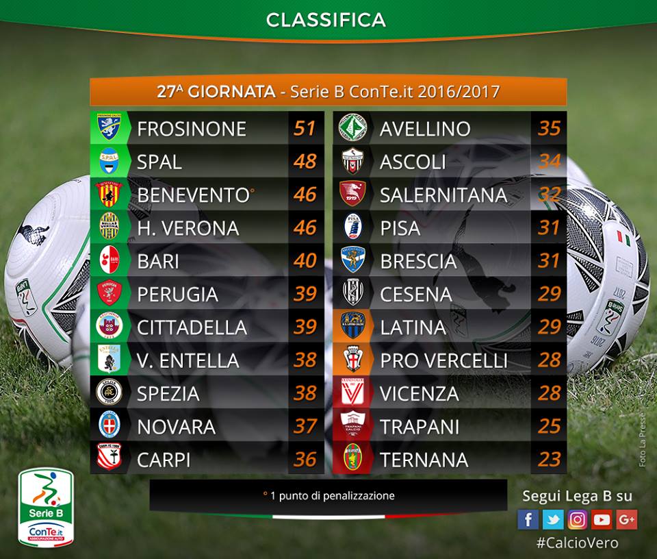 Il Frosinone consolida il primato della serie cadetta. Grazie ad un discusso penalty trasformato da Daniel Ciofani, i ciociari vincono 1-0 sull’Hellas Verona. Disco rosso anche per il Benevento che nell’anticipo del Venerdì cade tra le mura amiche del “Vigorito” contro il Bari. 4-3 il finale in favore dei pugliesi. Padroni di casa per primi in vantaggio con Lopez, poi gli ospiti si portano sul 3-1 con i gol di Galano, Floro Flores e Salzano. Sul finire del primo tempo Cissè accorcia le distanze per il Benevento. Benevento che non si ferma e che ad inizio ripresa acciuffa il pari grazie a Ceravolo. Pochi minuti più tardi Galano sigla il gol del definitivo 4-3. Ad approfittare del doppio stop scaligero e sannita è la Spal che sale al secondo posto in classifica battendo 2-0 il Perugia con i gol di Floccari e Schiattarella. Pesante sconfitta per il Cittadella che a Brescia ne incassa quattro. Le rondinelle vincono 4-1. Apre le marcature Andrea Caracciolo, poi il Cittadella pareggia con Strizzolo, prima della chiusura del primo tempo il Brescia va nuovamnete in gol con Blanchard, Coly e Dall’Oglio. Con i gol di Caputo e Catellani, la Virtus Entella liquida la pratica Carpi mantenendo la zona play off. Vittoria di misura del Novara che batte 2-1 lo Spezia. Piemontesi in vantaggio con Macheda, poi lo Spezia pareggia con Granoche, sul finire della prima frazione di gioco Galabinov sigla il gol del successo piemontese. Ancora un successo per il “ritrovato” Avellino di Novellino. Gli irpini battono con un netto 3-1 il Vicenza. Un doppietta del capitano D’Angelo e di Ardemagni i gol biancoverdi, per il Vicenza accorcia le distanze Bellomo. Brutta sconfitta casalinga per l’Ascoli. Al “Del Duca” il Pisa vince 4-2. All’immediato vantaggio bianconero siglato da Favilli rispondono per i toscani la doppietta di Masucci ed il gol di capitan Mannini. Ad inizio ripresa Cacia accorcia le distanze per l’Ascoli, poi Angiulli ristabilisce le distanze. Sconfitta casalinga anche per il Cesena che al “Manuzzi” regala l’intera posta in palio alla Pro Vercelli. 2-1 il finale in favore dei piemontesi. Pro Vercelli in vantaggio per prima con Rolando Bianchi poi dopo sessanta secondi i padroni di casa pareggiano con Rigione. Il gol del succeso ospite lo sigla Emanuello all’82’. Il Latina si aggiudica lo scontro salvezza contro la Ternana. I pontini espugnano il “Liberati” grazie al gol di De Vitis.