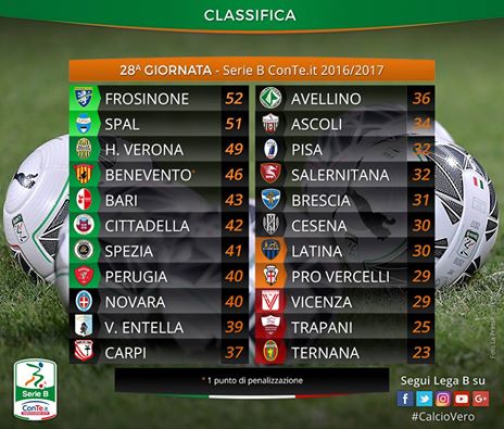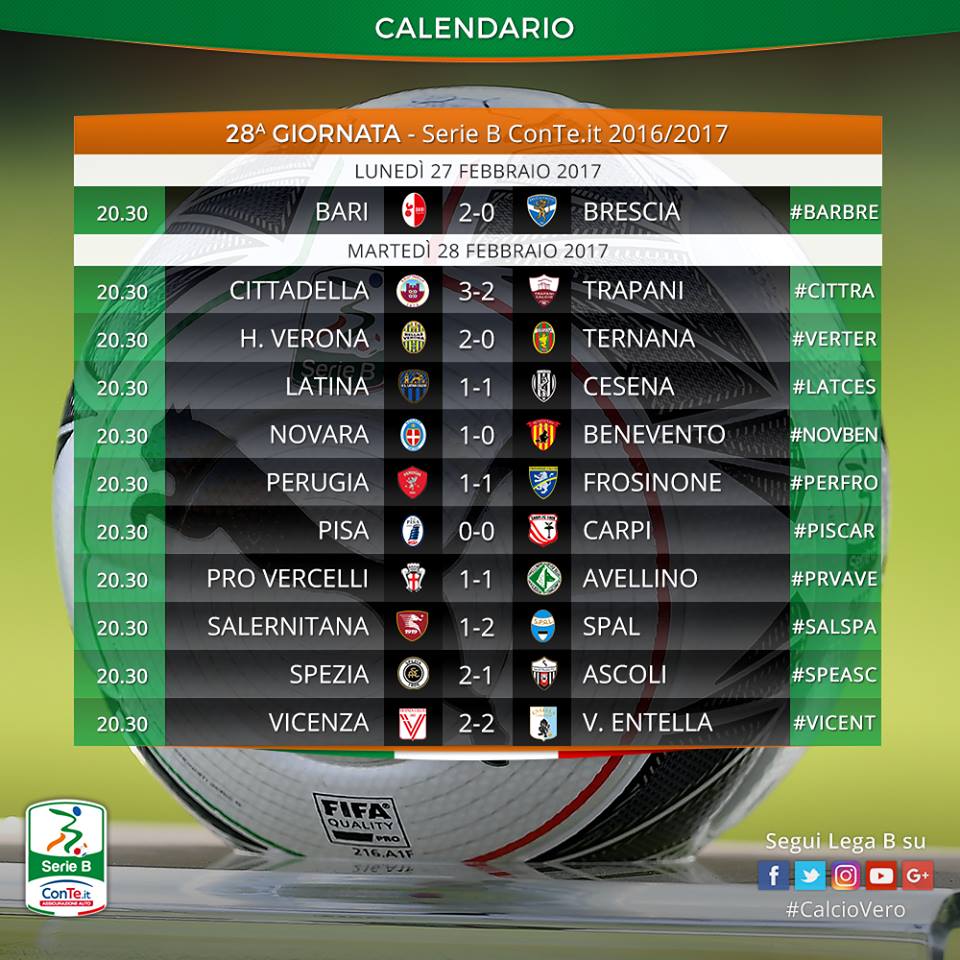 Nel turno infrasettimanale della serie cadetta il Frosinone conquista un importante pari a Perugia che gli permette di rimanere solitario in vetta. Al “Curi” i ciociari passano in vantaggio con Kragl, poi nella ripresa Nicastro pareggia i conti per gli umbri. L’Hellas Verona torna a vincere. Con una doppietta di Pazzini, gli scaligeri liquidano la pratica Ternana. Il Benevento incassa il secondo stop consecutivo cadendo 1-0 a Novara. A decidere il match un gol di Troest. Continua la rincorsa del Bari che al “San Nicola” batte 2-0 il Brescia. I gol portano la firma di Parigini e Galano. Pirotecnico 3-2 tra Cittadella e Trapani. Al vantaggio siciliano siglato da Coronado i veneti rispondono con i gol di Chiaretti e Iunco, poi sul finire di gara il Trapani agguanta il pari con un penalty trasformato da Citro ma a tempo oramai scaduto Iori regala i tre punti ai padroni di casa. Lo Spezia ritrova il successo battendo di misura l’Ascoli. 2-1 il finale con i liguri che vanno in gol con Piccolo e Djokovic, per l’Ascoli accorcia le distanze il francese Gigliotti. La Virtus Entella pareggia 2-2 a Vicenza. Padroni di casa in vantaggio con De Luca, poi l’undici di Breda ribalta il match grazie ad un autogoal di Esposito e ad un gol di Pellizzer. Unico pareggio a reti bianche della giornata è Pisa-Carpi. L’Avellino va vicino al terzo successo consecutivo pareggiando 1-1 a Vercelli. Dopo essere passati in vantaggio con Verdi, gli iripini incassano il gol piemontese al 95′ su calcio di rigore trasformato dall’ex Comi. Finisce 1-1 l’altro scontro salvezza tra Latina e Cesena. Romagnoli in vantaggio con Cocco, poi nella ripresa Dellafiore pareggia i conti.