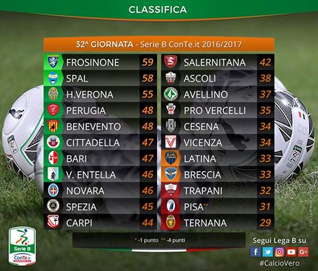 Il Frosinone non conosce più ostacoli. I ciociari si aggiudicano il match contro la prima della classe andando ad espugnare il “Mazza” di Ferrara con un rotondo 2-0. Ciofani e Ariaudo confezionano il successo. L’Hellas Verona non ne approfitta. Glia scaligeri si fanno imporre l’1-1 casalingo dal Pisa. Al vantaggio dei padroni di casa siglato da Siligardi, nella ripresa risponde Tabanelli. Carpi e Perugia pareggiano 0-0. Nell’anticipo di ieri sera, sconfitta casalinga per il Benevento che cede l’intera posta in palio al Trapani. 3-1 il finale in favore dei siciliani i gol con Coronado, una doppietta su penalty per lui, e Curiale. Ceravolo aveva raggiunto il momentaneo pareggio. Vittoria di misura del Cittadella sullo Spezia. Il gol di Kouame decide il match. Vittoria in rimonta per la Virtus Entella sul Cesena. Romagnoli in vantaggio con Crimi, poi prima con Caputo su calcio di rigore e poi con Catellani i liguri ribaltano il match. Sonante sconfitta per l’Avellino a Terni. Le fere vincono con un pesante 4-1. Ternana in gol con Avenatti su penalty, Palombi, Meccariello e Falletti. Il gol della bandiera irpino lo signa Ardemagni su calcio di rigore. Altro pareggio a reti bianche della giornata è quello tra Latina e Pro Vercelli. Pareggio per 1-1 tra Vicenza e Brescia. Rondinelle in vantaggio con Blanchard, i veneti pareggiano con Pucino. Il quadro si è completato in serata con Bari-Novara. Il match del “San Nicola” finisce a reti inviolate.