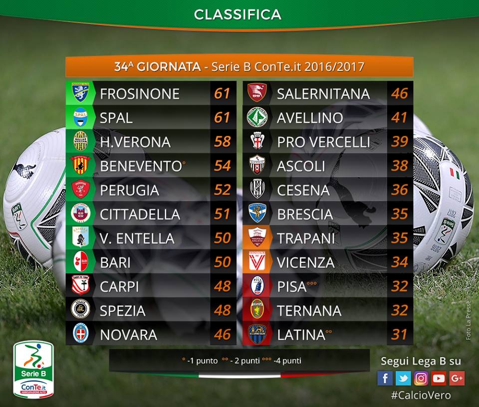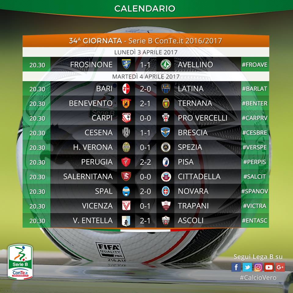 La Spal batte il Novara ed aggancia il Frosinone in vetta alla classifica della Serie B. Nel turno infrasettimanale valevole per la 34esima giornata, gli estensi, approfittando del pari casalingo del Frosinone fermato sull’1-1 dall’Avellino, vincono 2-0 grazie ai gol di Antenucci su calcio di rigore e Schiavon. Brutto stop interno del Verona che perde 1-0 con lo Spezia per effetto del gol di Granoche su penalty. Secondo successo consecutivo del Benevento che batte 2-1 la Ternana. Sanniti che si portano sul 2-0 grazie ad una doppietta di Ceravolo, per gli umbri Meccariello accorcia le distanze. Pareggio in extremis del Pisa che a Perugia impone il 2-2 ai grifoni. Padroni di casa che si portano subito sul 2-0 con i gol di Mustacchio e Gnahore poi i nerazzurri recuperano il match grazie alle marcature di Di Tacchio e Lisuzzo. Vittoria di misura della Virtus Entella sull’Ascoli. 2-1 il finale con i liguri che passano in vantaggio grazie a Troiano, pari dei marchigiani con Cacia su calcio di rigore, poi sempre su penalty Caputo sigla il gol del successo della Virtus. Pareggio a reti bianche tra Carpi e Pro Vercelli. Il Bari mette fine al periodo nero che lo attanagliava da diverse settimane battendo 2-0 il Latina. Dopo un brutto primo tempo, nella ripresa Galano e Fedele regalano il successo ai galletti. Finisce in parità, 1-1, lo scontro salvezza tra Cesena e Brescia. Romagnoli in vantaggio con Schiavone, poi è Coly a pareggiare i conti per le rondinelle. Con un gol di Casasola, il Trapani sbanca il “Menti” di Vicenza e si rimette in gioco per i play out.
