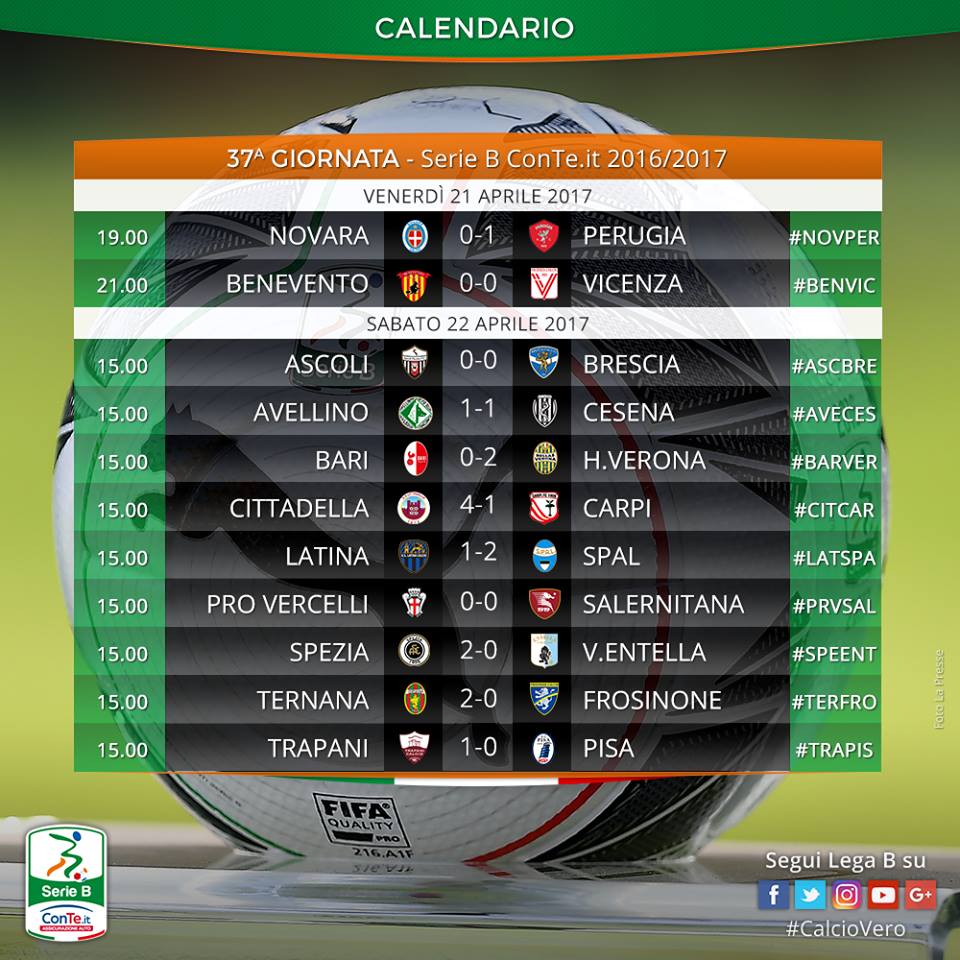 Spal ed Hellas Verona allungano sul Frosinone prendendo la direzione serie A. Questo è il verdetto della 37esima giornata del campionato cadetto. Colpo esterno degli estensi che violano il campo del Latina e dopo essere andati in svantaggio per il gol del pontino Corvia, ribaltano il match grazie ai gol di Bonifazi e Antenucci. Vittoria a domicilio anche per l’Hellas Verona che batte 2-0 il Bari. I gol portano la firma di Pazzini e Zuculini. Secondo stop consecutivo per il Frosinone. I ciociari cadono 2-0 a Terni per effetto della doppietta del rossoverde Palombi. All’inseguimento dei ciociari il Cittadella di Venturato. I veneti maramaldeggiano il Carpi con un sonante 4-1. Eppure i romagnoli erano passati per primi in vantaggio con un gol di Mbakogu, poi i padroni di casa vanno in gol con Arrighini, Iori su calcio di rigore, Valzania e Paolucci ancora su calcio di rigore. Vittoria di misura del Perugia che sbanca il terreno di gioco del Novara grazie ad un gol di Dezi. Il Benevento è fermato sullo 0-0 casalingo dal Vicenza del neo tecnico Torrente. Lo Spezia si aggiudica il derby ligure con la Virtus Entella. 2-0 il finale grazie ai gol di Migliore e Pulzetti. Termina 1-1 lo scontro salvezza tra Avellino e Cesena. Irpini in vantaggio con un gran gol di Ardemagni, poi il Cesena pareggia i conti grazie a Laribi ed alla complicità dell’estermo difensore irpino Radunovic che si lascia sfuggire il pallone di mano. Pareggio a reti bianche tra Ascoli e Brescia. Con un gol nel finale del salernitano Citro, il Trapani batte il Pisa ed esce dalla retrocessione diretta.