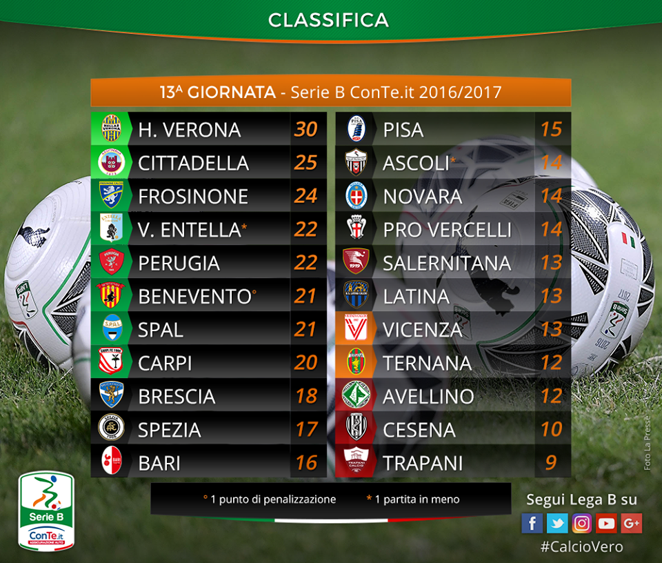 Il Benevento si riprende la zona play-off andando a vincere 1-0 a Terni. A regalare il successo ai sanniti e’ l’ex rossoverde Ceravolo. Con un calcio di rigore trasformato da Ciofani, il Frosinone espugna il “Partenio-Lombardi” di Avellino e diventa la terza forza del campionato cadetto. Serie B che vede il Verona sempre più incontrastato dominatore del campionato. E’ questo il verdetto della 13^ giornata che dopo il 3-2 del Brescia contro il Cesena nell’anticipo di venerdì, ha visto il roboante successo del Verona a La Spezia. 4-1 il finale in favore degli scaligeri. Unica squadra a tener testa a Pazzini e compagni è il Cittadella che supera 2-0 la Salernitana. L’Entella è bloccata dal terremoto che ha coinvolto le Marche e quindi dovrà recuperare il match contro l’Ascoli. Ancora un successo per il “ritrovato” Perugia che con un gol di Nicastro sbanca l’ “Arena Garibaldi” di Pisa. Colpo esterno anche per la Spal che va a vincere 1-0 sul campo del Novara. Unico 0-0 della giornata è quello tra Pro Vercelli e Carpi. Situazione difficile per il Bari di Stellone che a Latina incassa la quinta sconfitta stagionale. I pontini vincono 2-1 e risalgono dai bassifondi della classifica. Il Vicenza si aggiudica il match tra le ultime della classe andando a vincere a Trapani 1-0. Il gol del successo veneto porta la firma di Bellomo.