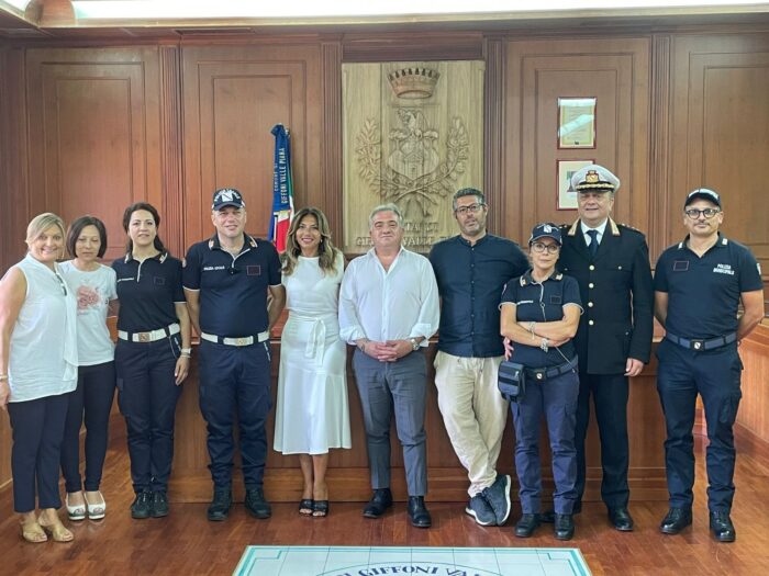 Sei nuovi agenti per la Polizia Locale di Giffoni Valle Piana. Nella mattinata di ieri, il Sindaco Antonio Giuliano, insieme al Comandante Rosario Muro, ha accolto in Palazzo di Città i sei nuovi membri del corpo di Polizia Locale, da ieri al lavoro dopo l’esito nelle scorse settimane del concorso indetto nei mesi scorsi dall’Amministrazione Comunale. Giulia Casino, Giovanni Carnevale, Caterina Cuomo, Pietro Pizzuti, Loredana Bruno e Giuseppe Balzano sono dunque a disposizione del corpo locale per innalzare il livello di sicurezza e rafforzare le attività di pattugliamento e controllo sull’intero territorio comunale.