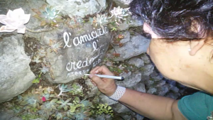 “La felicità è credere nel valore dell’amicizia. Non c’è pace senza giustizia, non c’è giustizia senza perdono, la serenità è l’anticamera della felicità”. Sono solo alcune delle scritte srotolate sul muro, pietre ed una panchina colorata, che è possibile leggere arrivando alla Curva della Madonna delle Rose di Sieti di Giffoni Sei Casali che, dopo i versi del poeta Davide Rondoni e le frasi della signora Mariapia D’Acunto Tedesco, si carica di nuove emozioni.