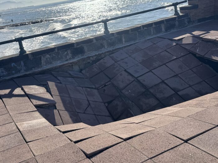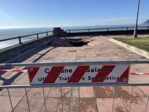 Una profonda voragine si è aperta questa mattina nell’area dei giardinetti di Torrione, dove nella serata di ieri il Comune di Salerno aveva, proprio in virtù di un vistoso avvallamento, deciso di interdire il passaggio delle persone. Un intervento provvidenziale che, probabilmente, ha evitato che lo sprofondamento potesse avere conseguenze più gravi, in un orario, quello della mattina quando i giardinetti sono frequentati da tantissime persone, che vengono qui a passeggiare a pochi passi dal mare. È tra i tanti cittadini che sono venuti a vedere cosa è accaduto c’è rabbia e indignazione per il danno. Tutta l’area dei giardinetti mostra infatti vistosi segnali di cedimento alla forza del mare che, in altri punti, un po’ più avanti, nei pressi del pattinodromo ha già avuto la meglio sulle opere realizzate. Qui la forza del mare ha segnato ancora una volta un punto a suo favore. Anche questo tratto del lungomare è interessato dai lavori di ripascimento e, a poca distanza dal punto in cui è venuto giù il pavimento, c’è già la barriera soffolta che avrebbe dovuto rappresentare una prima forma di difesa dell’arredo urbano dalla potenza delle onde. Intorno alle 11 il primo sopralluogo con il dirigente del Settore Opere e Lavori Pubblici, ingegnere Giovanni Micillo che ha verificato la tenuta del muro di contenimento sottostante. In nessun punto esterno ci sono segni di cedimento, quindi il mare sta scavando da sotto. Intorno alle 12 la polizia municipale ha interdetto in maniera più incisiva la zona pericolosa.