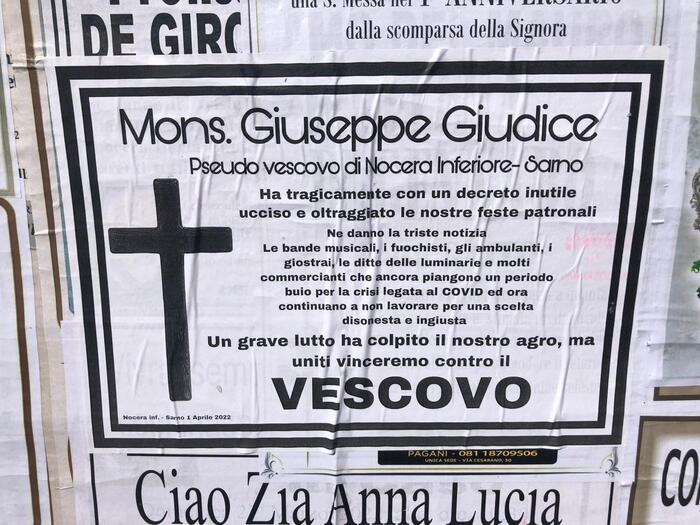 Un macabro manifesto funebre rivolto al vescovo della diocesi di Nocera-Sarno, Giuseppe Giudice è stato affisso in diversi comuni dell’Agro Nocerino Sarnese.
