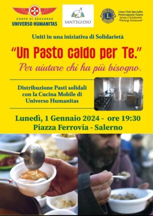 Un pasto caldo per aiutare chi ne ha piu’ bisogno. Ancora una volta il corpo di soccorso dell’ Associazione Universo Humanitas, con la Comunita’ di Sant’Egidio ed il Lions Club di Pontecagnano Faiano “Pierluigi Schiavone , nel giorno di capodanno, lunedì 1 gennaio alle ore 19.30 distribuirà pasti solidali con la Cucina Mobile di Universo […]