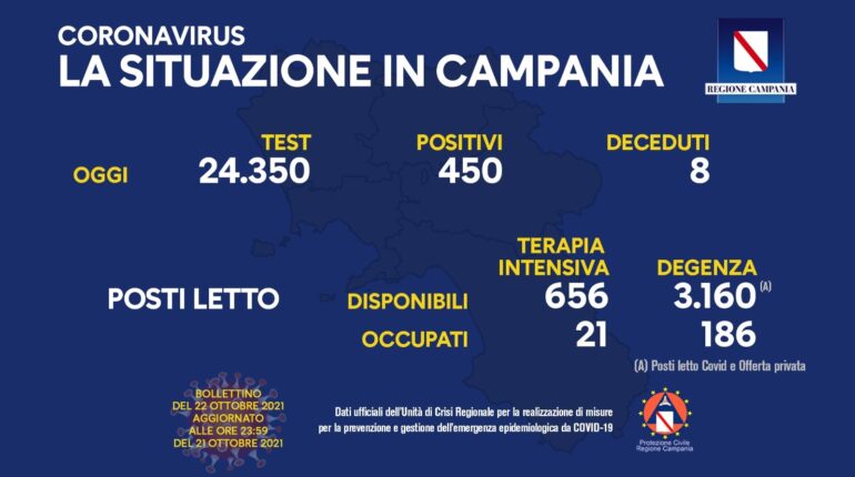 Torna a salire il tasso di incidenza per il Covid in Campania: si passa dall’1,40% di ieri all’1,84 di oggi. Secondo i dati dell’Unità di crisi della Regione sono 450 i positivi su 24.350 test. I morti sono 8. Cala l’occupazione dei posti letto. vi sono 21 ricoverati in terapia intensiva (meno 2) e 186 […]