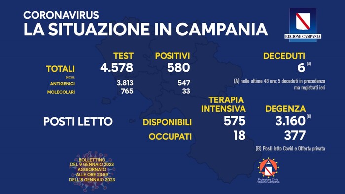 Sono 580, su 4.578 test esaminati, i nuovi positivi al Covid in Campania. Il tasso di incidenza è del 12,66% contro il 13,9 di ieri. Nelle ultime 48 ore si sono registrati sei decessi, cui si sommano i cinque dei giorni scorsi ma censiti nell’ultimo bollettino regionale. In aumento i ricoveri, sia nelle terapie intensive […]
