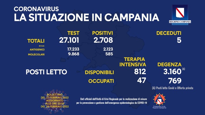 Sono 2.708 i positivi al Covid del giorno in Campania su un totale di 27.101 test effettuati per un indice di contagio pari al 10%, in leggera flessione rispetto al 10, 52% di ieri. Dei 27.101 esami 17.233 sono quelli antigenici e 9.868 i molecolari. Cinque le persone decedute nelle ultime 48 ore. I posti […]