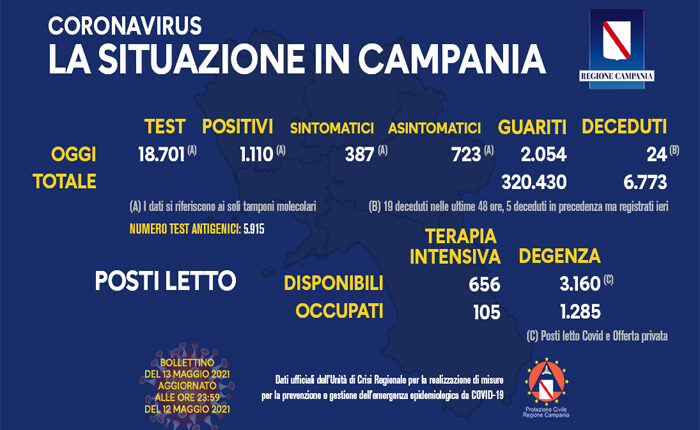 Sono 1.110 i nuovi casi di Covid in Campania, di cui 387 sintomatici, su 18.701 test molecolari esaminati. Il tasso di incidenza, calcolato senza tenere conto dei tamponi antigenici, è del 5,93%, sostanzialmente stabile rispetto al 6,18 di ieri. Il bollettino dell’Unità di crisi segnala 24 nuove vittime e ben 2.054 guariti. Continua ad alleggerirsi […]