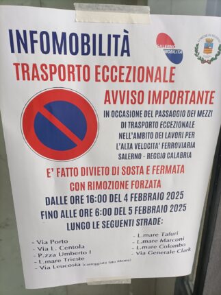 Per consentire un nuovo passaggio del trasporto eccezionale per i mezzi dell’Alta Velocita ferroviaria per la realizzazione della linea Salerno-Reggio Calabria, a partire da domani pomeriggio alle ore 16 e fino alle ore 6 del 5 febbraio si rendono necessarie delle limitazioni al transito nella città di Salerno. Lungo il tratto che va dal porto […]